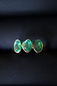 3.Emerald trilogy ring bezel set in yellow gold