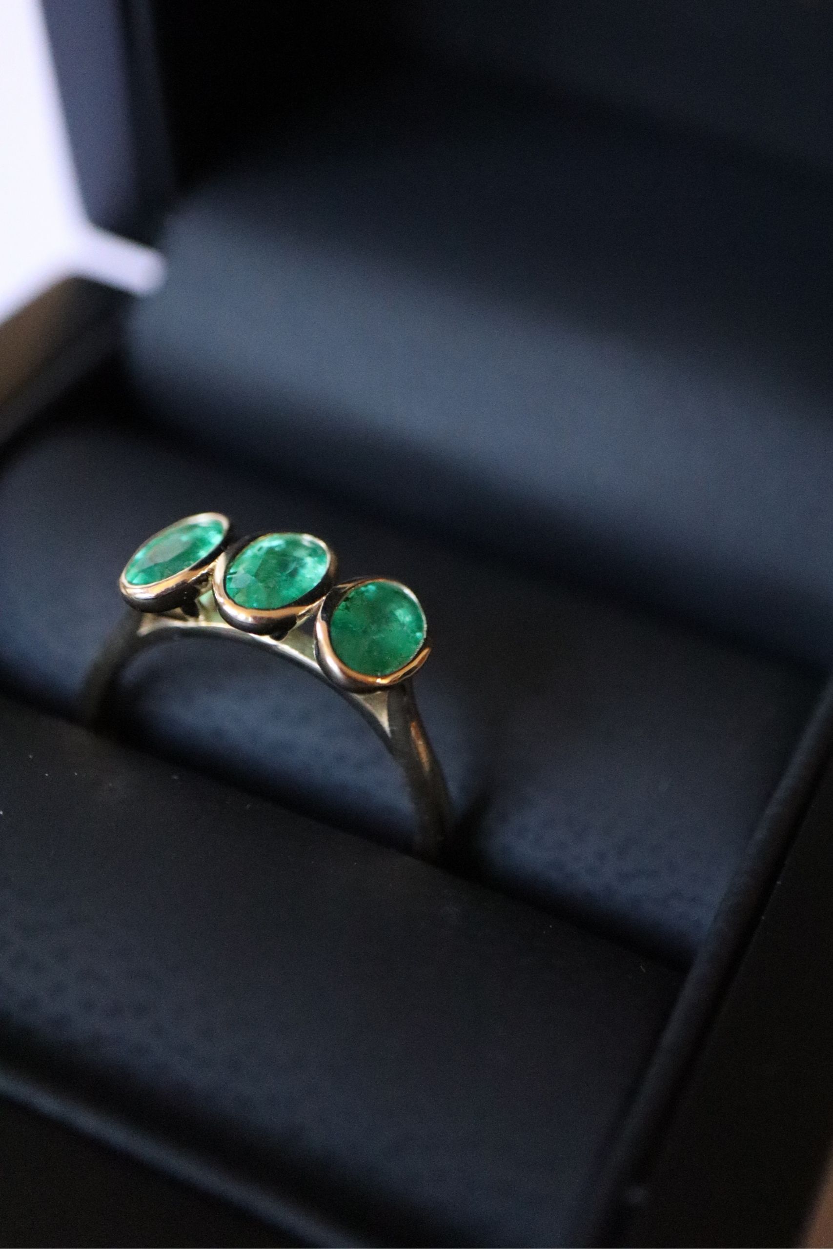 4.Emerald trilogy ring bezel set in yellow gold